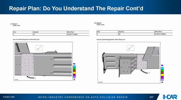 But in addition, he said, depending on which of two zones is being repaired, “you actually have to make these panels out of the service part that you have to rivet bond over the top of the area you just welded. So when you’re doing the repair planning, if you just quickly go through that procedure, you might think, ‘Oh we just need to weld it.’ Well, no, you have to make these parts. You have to do the rivets. So if you’re not truly understanding the procedure, and have those rivets in-stock, there’s no way the technician is going to know what to do, and he’s going to make a mistake or only do part of it.”