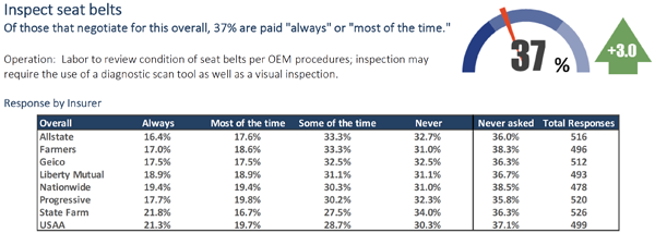 We’ve been asking about seat belt inspections in our “Who Pays for What?” surveys dating back to 2016. On the surface, the news is good. Back in 2016, close to two-thirds of shops said they’d never billed for the labor involved in inspecting seat belts, and among those who had, fewer than one in four said they were paid for that work by the eight largest national insurers “always” or “most of the time.”