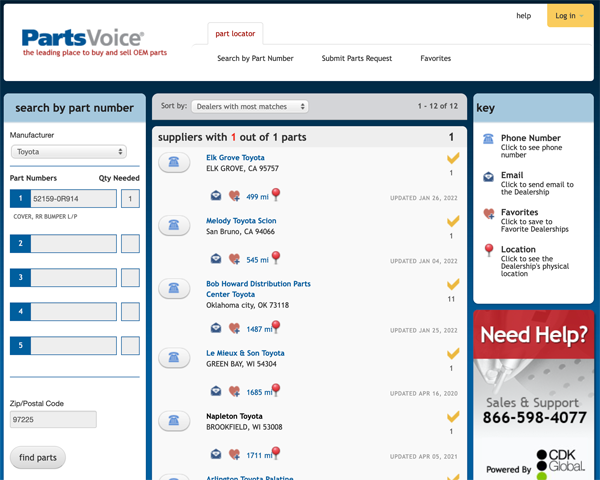 One great website is www.partsvoice.com. It’s a free resource. You enter the vehicle information, the part number or numbers, and your ZIP code. Up pops a list of the dealers around the country who have that part in stock, showing you the number they have and when that inventory was last updated.